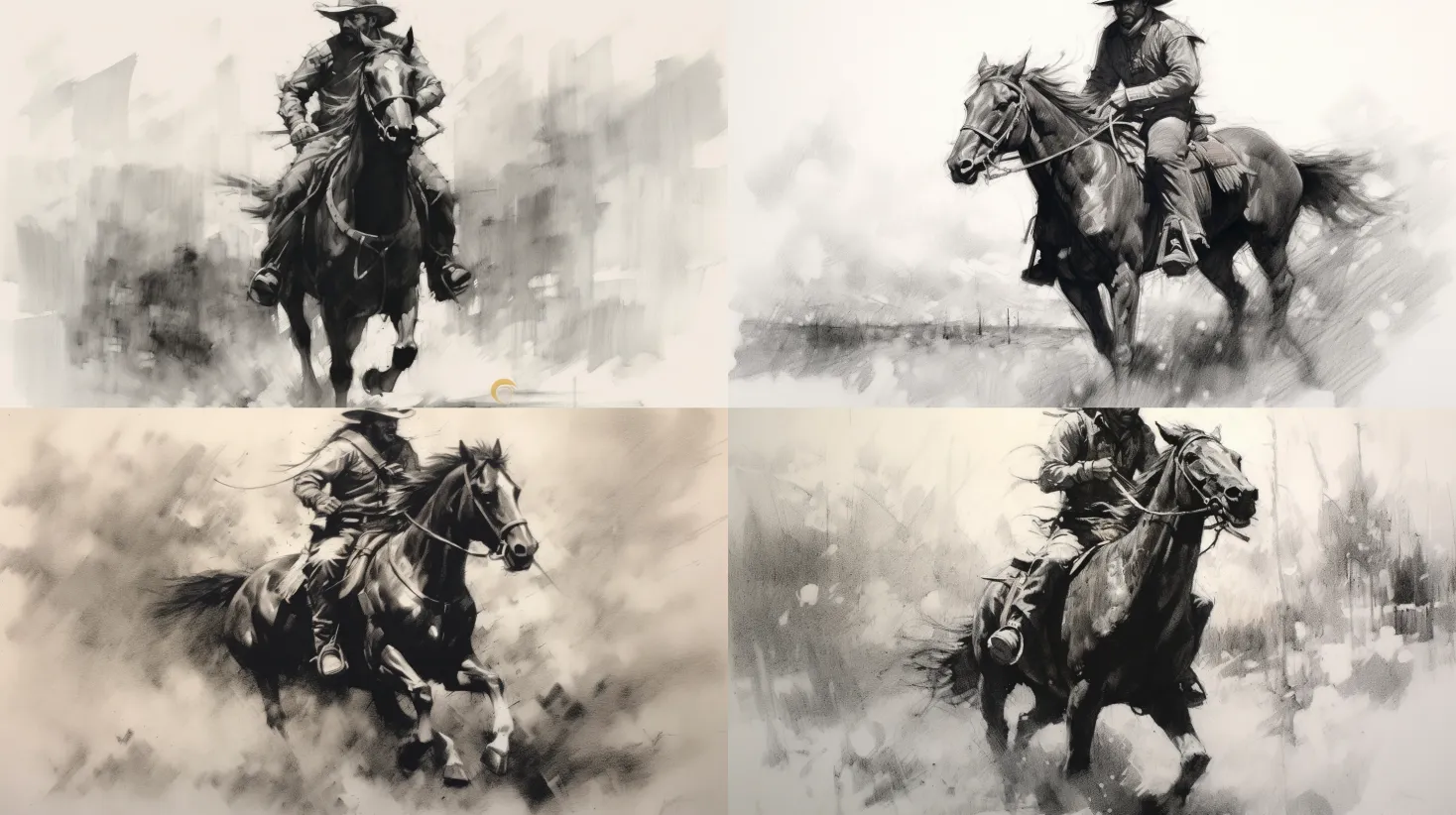 A portrayal of a rugged cowboy on horseback, embodying the spirit of the American West and the iconic figure of the cowboy. Medium: charcoal drawing. Style: expressive and dynamic. Composition: capturing the cowboy's strength, independence, and connection with his trusty steed. --ar 16:9 --v 5.1 --style raw --q 2 --s 750An atmospheric depiction of a vibrant sunset over a Western desert landscape, capturing the vastness and rugged beauty of the frontier. Medium: oil painting. Style: realistic with warm, earthy tones. Composition: showcasing silhouettes of cacti, mesas, and the dramatic colors of the setting sun. --ar 16:9 --v 5.1 --style raw --q 2 --s 750An illustration of a deserted Western ghost town, evoking the nostalgia and mystery of abandoned frontier settlements. Medium: digital painting. Style: moody and atmospheric. Composition: showcasing dilapidated buildings, tumbleweeds, and the sense of solitude in the once-thriving town. --ar 16:9 --v 5.1 --style raw --q 2 --s 750A scene depicting cowboys gathered around a campfire under a starry Western sky, capturing the camaraderie and adventure of the open range. Medium: mixed media (digital and hand-drawn elements). Style: warm colors and rugged textures. Composition: highlighting the glowing embers, silhouettes of cowboys, and the vastness of the night sky. --ar 16:9 --v 5.1 --style raw --q 2 --s 750An illustration of a vintage steam locomotive chugging through the Western landscape, symbolizing the pioneering spirit of the era. Medium: ink drawing. Style: detailed and nostalgic. Composition: showcasing the intricate details of the locomotive, billowing smoke, and the vast expanse of the Western frontier. --ar 16:9 --v 5.1 --style raw --q 2 --s 750A depiction of a lively saloon pianist, entertaining patrons with Western tunes in a rustic, Old West saloon. Medium: digital illustration. Style: lively and vibrant. Composition: capturing the energy of the pianist, the atmosphere of the saloon, and the characters enjoying the music. --ar 16:9 --v 5.1 --style raw --q 2 --s 750A serene landscape showcasing the wide-open prairies of the Western frontier, conveying a sense of freedom and untamed beauty. Medium: acrylic painting. Style: realistic with sweeping brushstrokes. Composition: emphasizing the rolling hills, wild grasses, and the expanse of the sky in the vast prairie landscape. --ar 16:9 --v 5.1 --style raw --q 2 --s 750An energetic depiction of a cattle drive, with cowboys herding a large herd of cattle across the Western plains. Medium: digital painting. Style: dynamic and action-oriented. Composition: capturing the movement, dust, and the rugged determination of the cowboys as they guide the cattle. --ar 16:9 --v 5.1 --style raw --q 2 --s 750An idyllic scene of a Western sunset on the open range, featuring grazing horses, cowboys, and the golden hues of the setting sun. Medium: watercolor painting. Style: warm and impressionistic. Composition: capturing the tranquility and natural beauty of the Western landscape at twilight. --ar 16:9 --v 5.1 --style raw --q 2 --s 750An action-packed illustration of a Western rodeo, showcasing cowboys and cowgirls participating in thrilling events like bull riding, barrel racing, and roping. Medium: mixed media (digital and hand-drawn elements). Style: energetic and vibrant. Composition: capturing the adrenaline and excitement of the rodeo, with flying dirt, powerful animals, and skilled riders. --ar 16:9 --v 5.1 --style raw --q 2 --s 750An illustration of a rustic Western farm, portraying the simplicity and hard work of frontier life. Medium: pen and ink drawing. Style: detailed and nostalgic. Composition: showcasing a farmhouse, barn, fields, and farm animals, evoking the charm and resilience of rural Western communities. --ar 16:9 --v 5.1 --style raw --q 2 --s 750A peaceful depiction of a Western homestead at sunrise, with a log cabin, picket fence, and the soft light of dawn. Medium: digital painting. Style: serene and atmospheric. Composition: capturing the warmth and tranquility of a new day on the frontier, with the promise of possibility. --ar 16:9 --v 5.1 --style raw --q 2 --s 750A solitary cowboy on horseback, navigating the vast desert landscape of the American West. Medium: charcoal drawing. Style: contemplative and evocative. Composition: highlighting the isolation and self-reliance of the cowboy as they traverse the harsh terrain. --ar 16:9 --v 5.1 --style raw --q 2 --s 750An illustration of a majestic Western mountain range, depicting rugged peaks, deep valleys, and the rugged beauty of the wilderness. Medium: acrylic painting. Style: bold and textured. Composition: capturing the grandeur and untamed spirit of the Western mountains, with sweeping vistas and dramatic lighting. --ar 16:9 --v 5.1 --style raw --q 2 --s 750An action-packed scene of a Western air cavalry, featuring cowboys on horseback, flying in the sky with wings or contraptions, defending the land from aerial threats. Medium: digital illustration. Style: steampunk and adventurous. Composition: showcasing the aerial acrobatics, the unique flying devices, and the courage of the air cavalry. --ar 16:9 --v 5.1 --style raw --q 2 --s 750An oasis in the Western desert, where lush vegetation and a tranquil watering hole provide respite and sanctuary. Medium: watercolor painting. Style: vibrant and dreamlike. Composition: capturing the contrast between the arid desert surroundings and the lush oasis, creating a sense of serenity and relief. --ar 16:9 --v 5.1 --style raw --q 2 --s 750An illustration of a wild mustang herd, representing the untamed spirit and freedom of the American West. Medium: digital painting. Style: dynamic and expressive. Composition: showcasing the power and grace of the mustangs as they gallop across the open plains, their manes flowing in the wind. --ar 16:9 --v 5.1 --style raw --q 2 --s 750A depiction of a Western harvest scene, with farmers working diligently to gather crops against the backdrop of gol